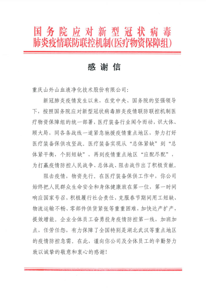 “謹(jǐn)向你公司及全體員工的辛勤努力致以誠摯的敬意及和衷心的感謝!希望你公司慎終如始,再接再厲、為全球抗擊疫情作出新的更大貢獻(xiàn)!”國務(wù)院的感謝信讓每一位山外山人都深受鼓舞和感動(dòng)。今后,山外山將不負(fù)重托,不負(fù)韶華,持續(xù)奮斗,為疫情防控取得全面勝利做出更多貢獻(xiàn),為中國血液凈化行業(yè)奉獻(xiàn)山外山力量!