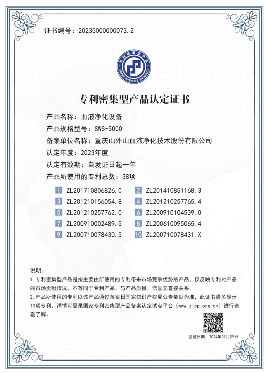 此外,SWS-5000系列連續(xù)性血液凈化設備前不久還通過了首批國家專利密集型產品認定。