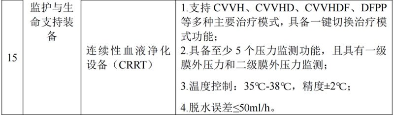 根據(jù)此前國家工信部及衛(wèi)健委發(fā)布的《2024年高端醫(yī)療裝備推廣應用項目申報工作的通知》,申報監(jiān)護與生命支持裝備項目中的連續(xù)性血液凈化設備(CRRT)需滿足以下四個要求: