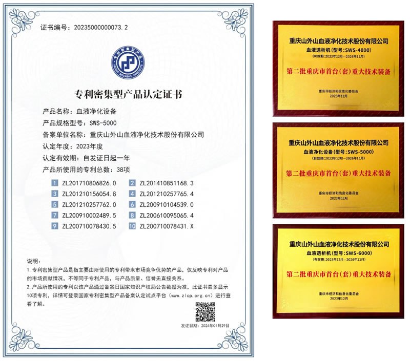 除了入選國家高端醫(yī)療裝備推廣應用項目目錄,SWS-5000連續(xù)性血液凈化設備還通過了首批國家專利密集型產品認定,與山外山SWS-4000、SWS-6000血液透析機一同被認定為第二批重慶市首臺(套)重大技術裝備產品。這些先進而精良的血液凈化設備,鐫刻著山外山的技術創(chuàng)新力量,也見證了中國追趕世界的速度。