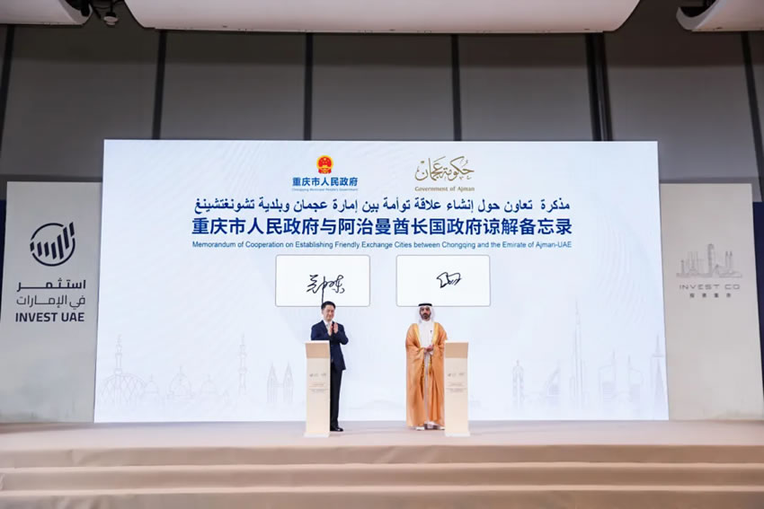 2025年5月23日,以“共享愿景·共享未來”為主題的“中國(重慶)—阿聯(lián)酋經(jīng)貿(mào)投資推介會”在渝舉行。阿治曼酋長國政府與重慶市政府在會上正式簽署友好城市合作諒解備忘錄,阿治曼酋長國王儲兼執(zhí)行委員會主席謝赫阿馬爾·努艾米、阿聯(lián)酋駐華大使侯賽因·哈馬迪、重慶市副市長鄭向東等數(shù)百位政商高層出席會議。