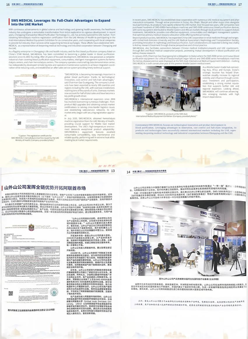 會上,雙方將在經(jīng)濟、科技、教育等12個領(lǐng)域建立常態(tài)化合作機制,預(yù)計帶動超百億元投資。值得關(guān)注的是,作為重慶生命健康產(chǎn)業(yè)的代表性企業(yè),重慶山外山血液凈化技術(shù)股份有限公司憑借在阿聯(lián)酋市場的深度布局與創(chuàng)新實踐,成為中國(重慶)和阿聯(lián)酋經(jīng)貿(mào)合作的八個核心案例之一。
